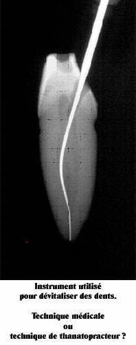 Ce sont des instruments longitudinaux qui extirpent la pulpe dentaire, raclent le canal dentaire pour l’élargir et le nettoyer pour ensuite pouvoir plus facilement le remplir d’une pâte ou d’un ciment qui va durcir et obturer l’espace vidé. On comprend facilement qu’il n’est pas possible ainsi d’avoir accès aux canaux accessoires qui sont représentés sur le schéma précédent. Ceux-ci restent donc remplis de matière organique et pourrissent inéluctablement en libérant dans le sang les produits de leur putréfaction. Les dentistes grâce à cette technique ont moins l’image d’arracheurs de dents mais plutôt l’image de micro-chirurgiens conservateurs de dents. En fait dévitaliser les dents ressemble plus d’un point de vue de la technique, à une technique d’embaumement de thanatopracteur qu’à une technique médicale à proprement parler. Les instruments utilisés pour dévitaliser la dent ressemblent un peu à des poignards enfoncés dans la dent pour la tuer, et munis d’aspérités pour en sortir les entrailles. L’aspect médical réside en fait principalement dans le fait qu’on supprime ici la douleur de la dent sans l’enlever puisqu’on extirpe le nerf qui peut exprimer cette douleur. Et c’est cela qui fait que les patients sont extrêmement contents car ils n’ont plus mal et conservent leur dent d’une certaine façon grâce à l’acte de dévitalisation dentaire. Puis quand des années plus tard, ils font leur cancer ou leurs autres maladies, ils ne font jamais le lien avec cet acte de dentiste réalisé des années auparavant. Le dentiste non plus d’ailleurs, d’autant plus que la dent ne fait pas mal et qu’en apparence, elle n’a donc que des avantages. Mais en réalité, biologiquement parlant, ce n’est plus une dent mais une dent empaillée en quelque sorte et cela est très différent. Mais ce n’est pas tout. L’histologie (la science des tissus biologiques) nous enseigne que la dentine ou l’ivoire qui constitue la masse de la dent n’est pas non plus de la pierre mais ressemble plutôt à une éponge constituée de millions de minuscules canaux, les canalicules ou tubulis dentinaires qui sont eux même remplis de matière organique. Ce sont les prolongements des cellules de la pulpe, les odontoblastes, qui fabriquent l’ivoire ou dentine. Ces tubulis dans la dent dévitalisée deviennent eux aussi des niches de bactéries qui sont aussi totalement indésinfectables.